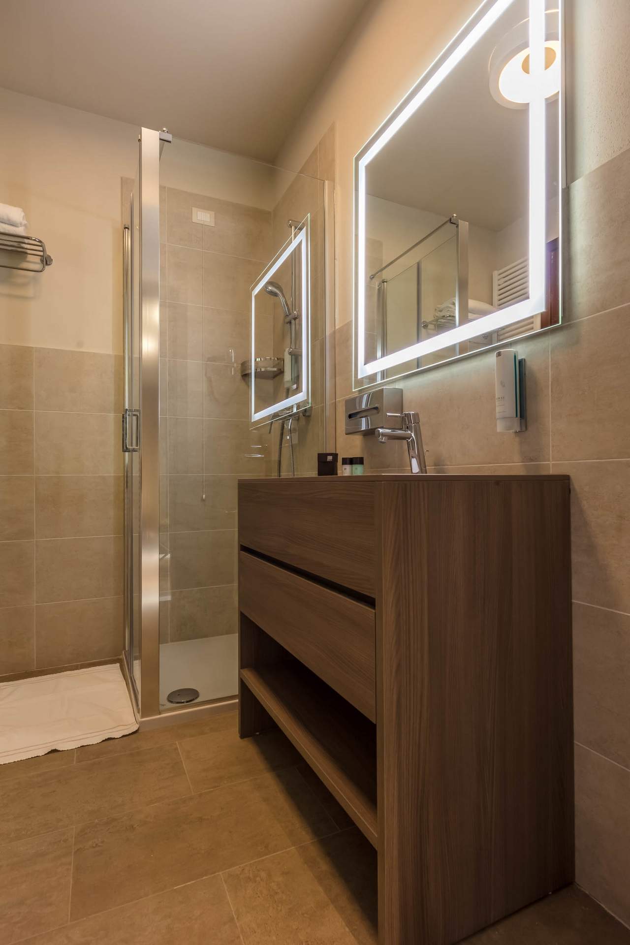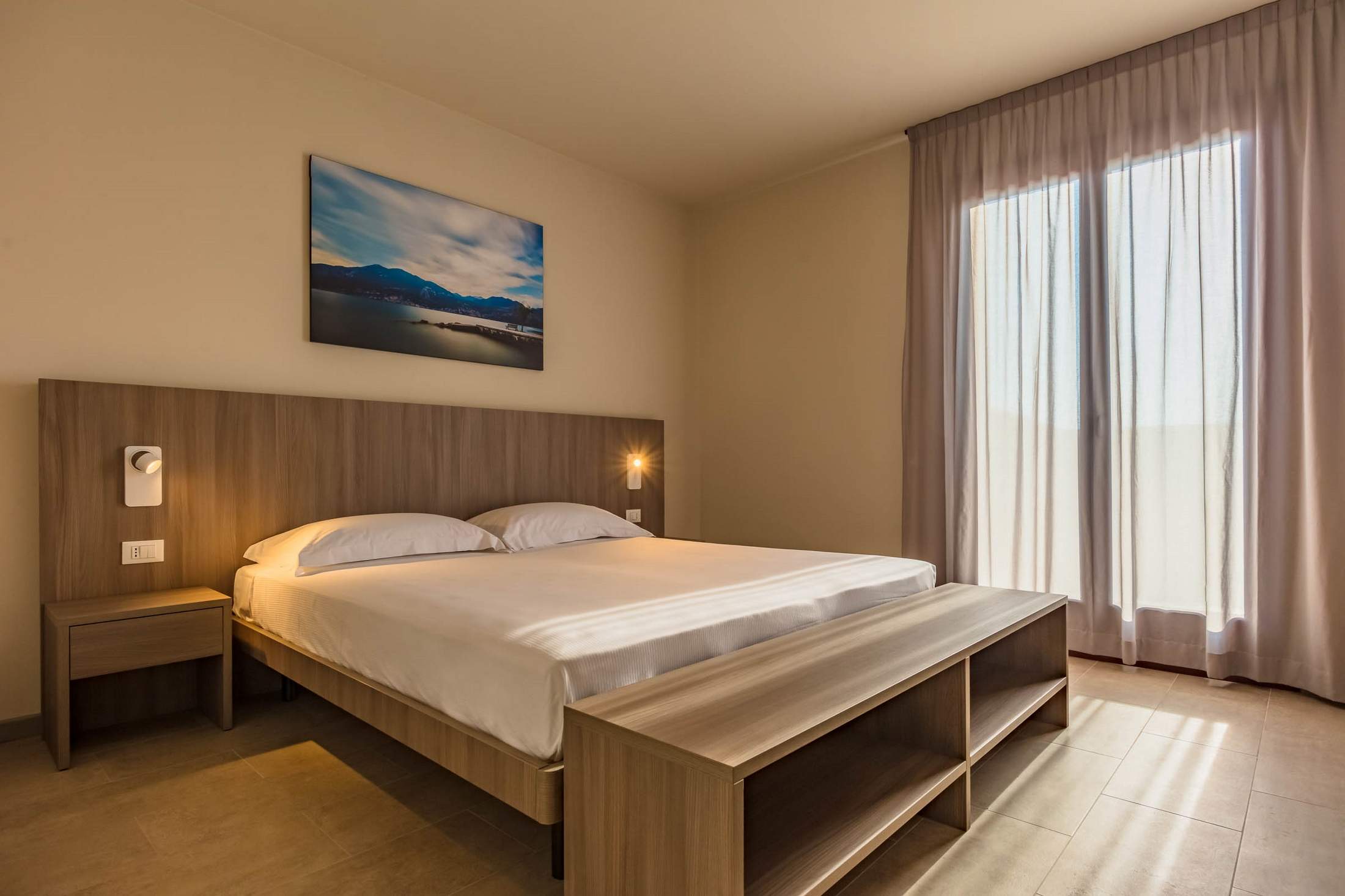 Die Grand Family Suite besteht aus 2 Schlafzimmern, 2 Badezimmern (eins mit Bad, das andere mit Dusche), einem Wohnzimmer (mit der Möglichkeit zwei Couchbetten oder ein Couchbett + ein Babybett dazuzustellen) einem Tisch mit 6 Sitzplätzen und einer großen Sonnenterrasse mit traumhaftem Seeblick. Sie ist über eine Treppe erreichbar.