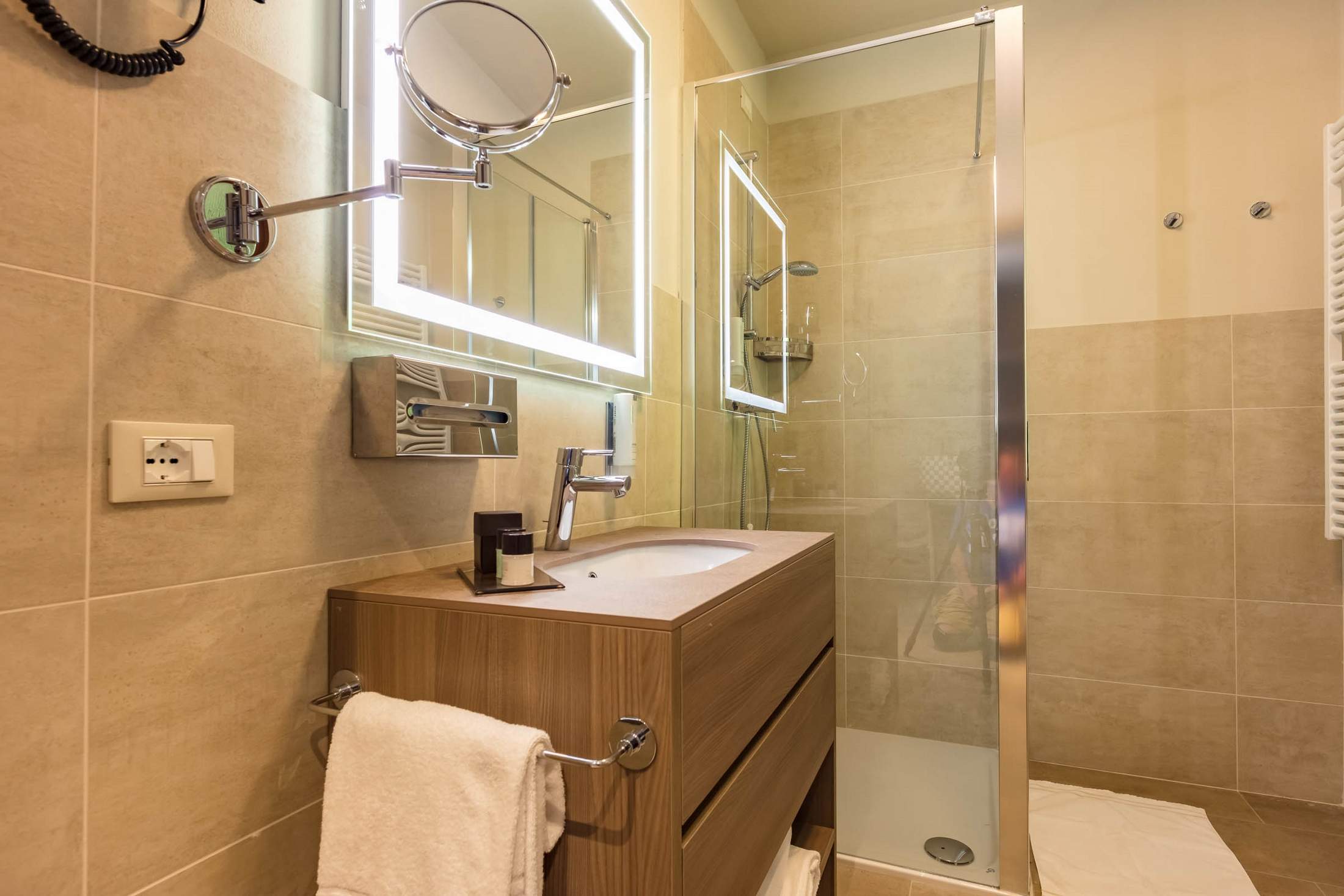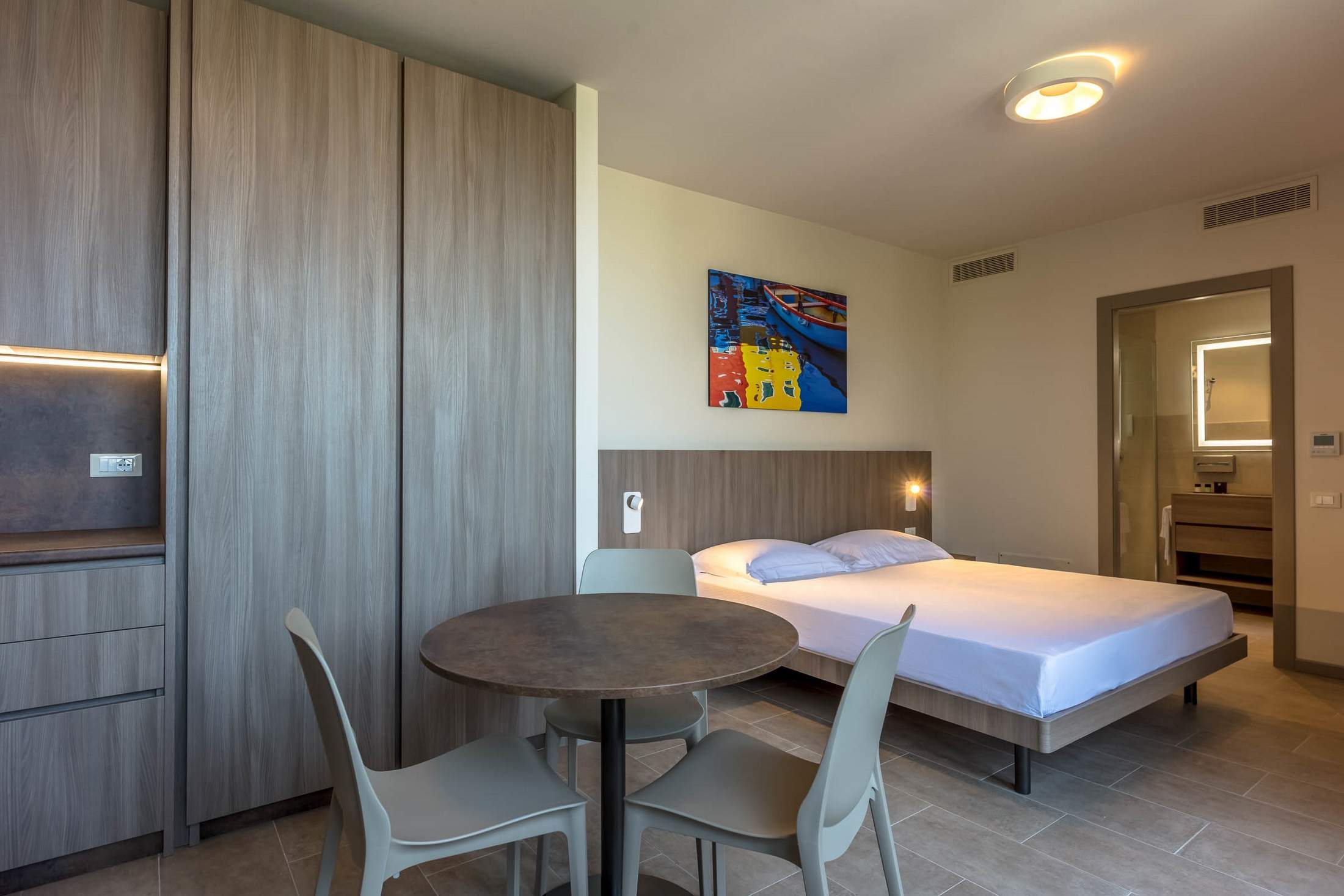 Bagno con doccia, asciugacapelli, vaschetta da bagno per neonati (su richiesta), angolo cottura con frigorifero, forno a microonde, piastra elettrica, posateria, Wi-Fi gratuito, Tv satellitare, telefono diretto, aria condizionata, cassaforte, tavolo con 3 sedie, servizio sveglia, ferro da stiro e asse da stiro (su richiesta), servizio lavanderia, balcone arredato